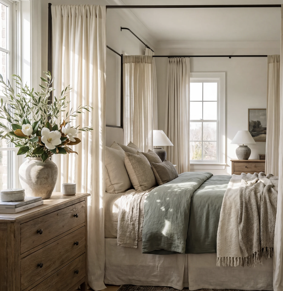 - Muted, earthy tones like sage, clay, and linen
