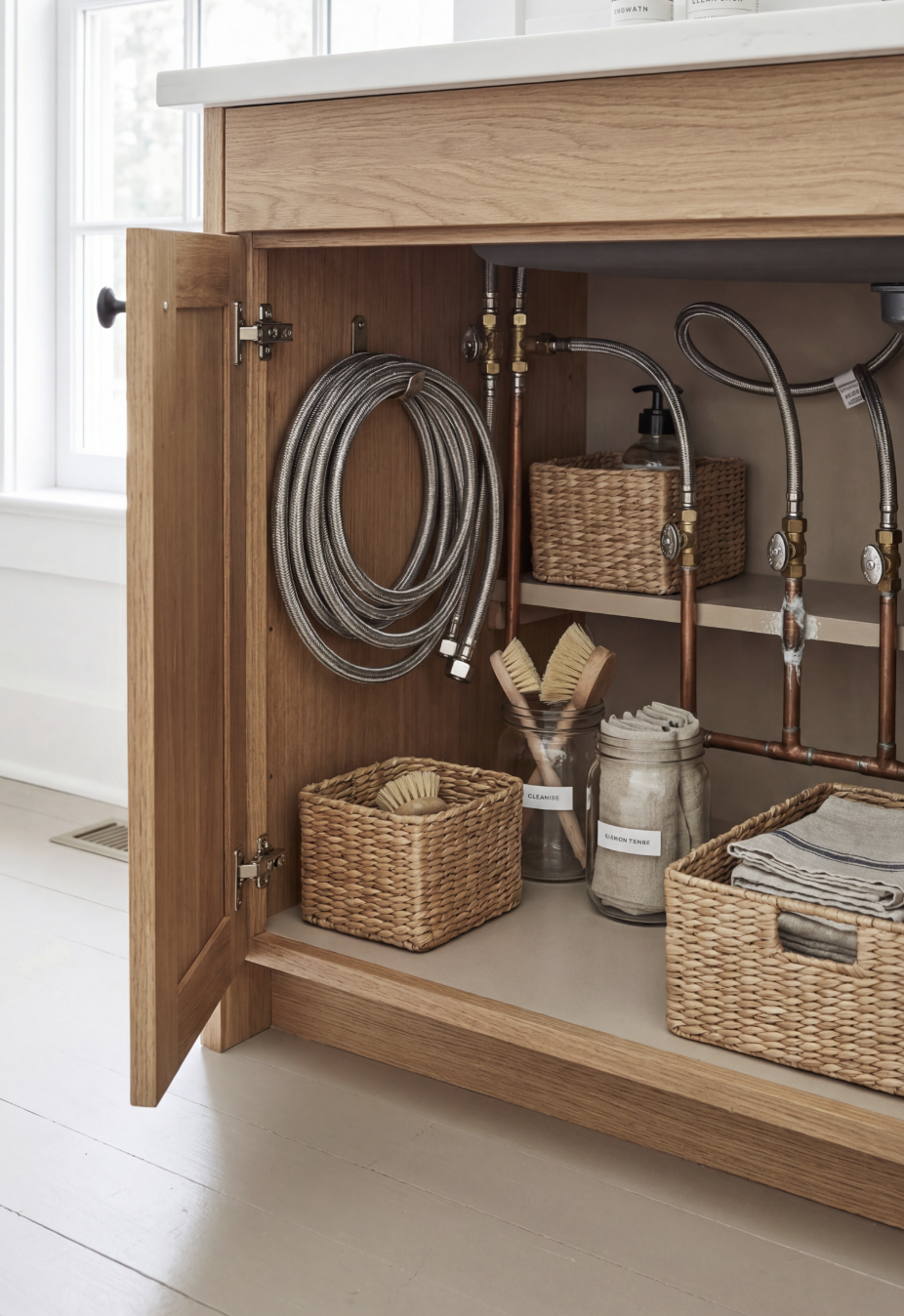 Water supply lines run behind walls, under sinks, and to appliances.