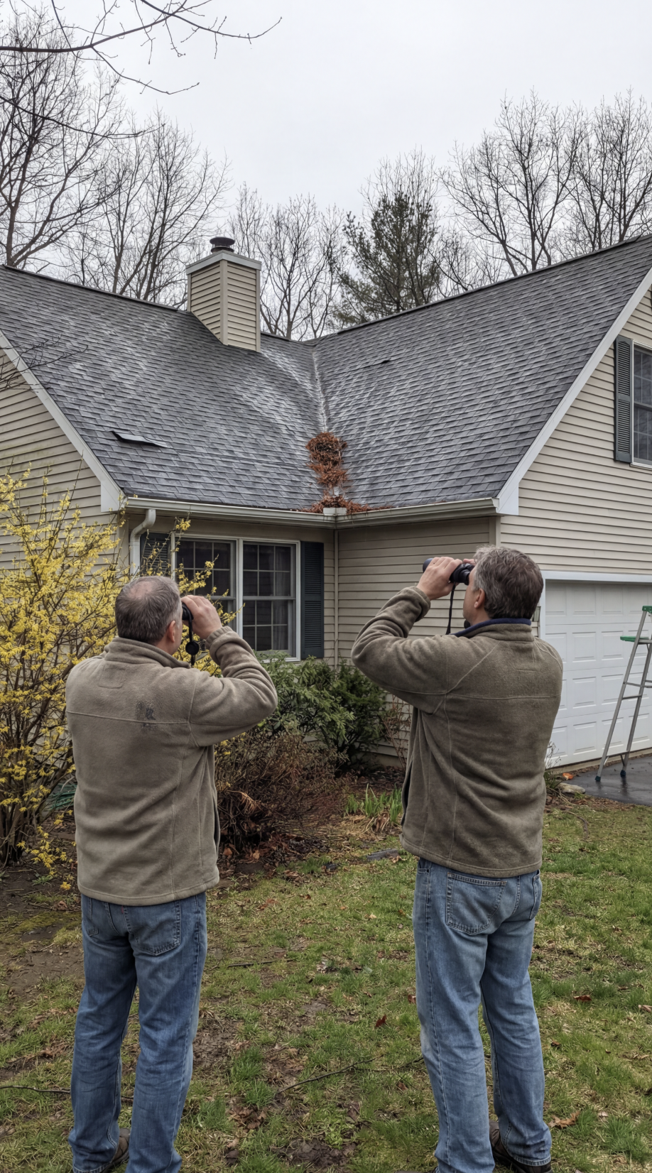 From the ground, inspect your roof with binoculars. Look for missing shingles, curling edges, or debris buildup in valleys.